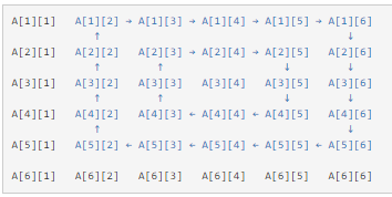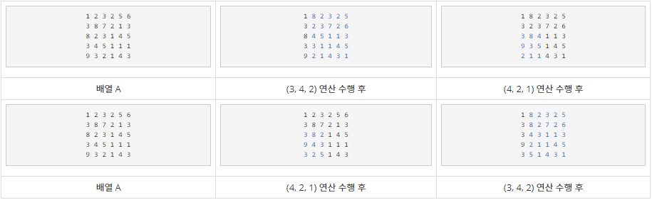 다음은 배열 A의 크기가 5×6이고, 회전 연산이 (3, 4, 2), (4, 2, 1)인 경우의 예시이다.