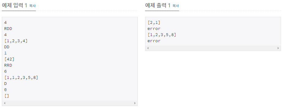 함수 R은 배열에 있는 숫자의 순서를 뒤집는 함수이고, D는 첫 번째 숫자를 버리는 함수이다. 배열이 비어있는데 D를 사용한 경우에는 에러가 발생한다.