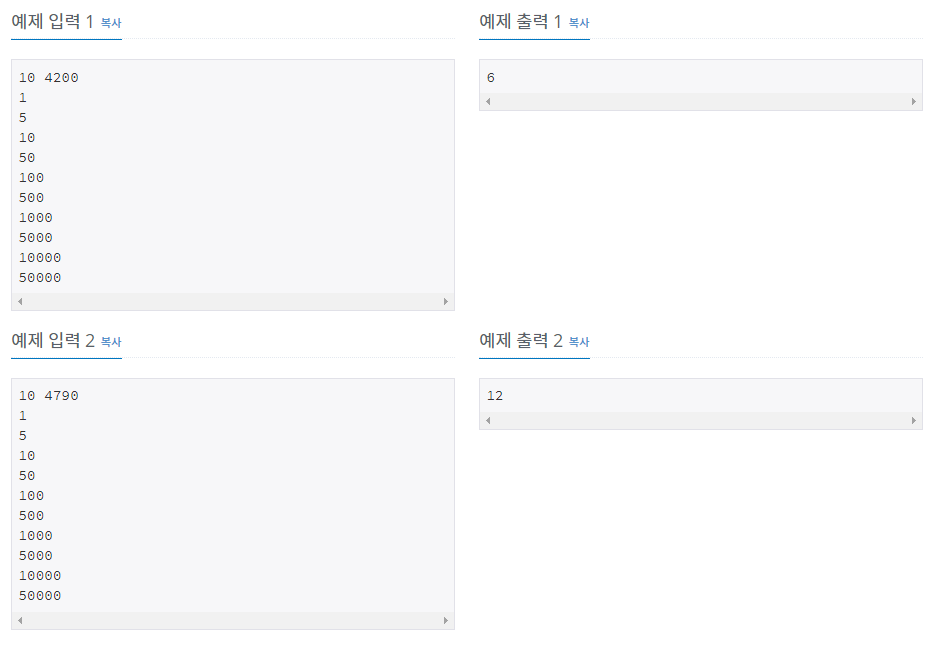 첫째 줄에 N과 K가 주어진다. (1 ≤ N ≤ 10, 1 ≤ K ≤ 100,000,000) 둘째 줄부터 N개의 줄에 동전의 가치 Ai가 오름차순으로 주어진다. (1 ≤ Ai ≤ 1,000,000, A1 = 1, i ≥ 2인 경우에 Ai는 Ai-1의 배수)