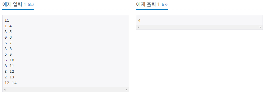 한 개의 회의실이 있는데 이를 사용하고자 하는 N개의 회의에 대하여 회의실 사용표를 만들려고 한다. 각 회의 I에 대해 시작시간과 끝나는 시간이 주어져 있고, 각 회의가 겹치지 않게 하면서 회의실을 사용할 수 있는 회의의 최대 개수를 찾아보자. 단, 회의는 한번 시작하면 중간에 중단될 수 없으며 한 회의가 끝나는 것과 동시에 다음 회의가 시작될 수 있다. 회의의 시작시간과 끝나는 시간이 같을 수도 있다. 이 경우에는 시작하자마자 끝나는 것으로 생각하면 된다.