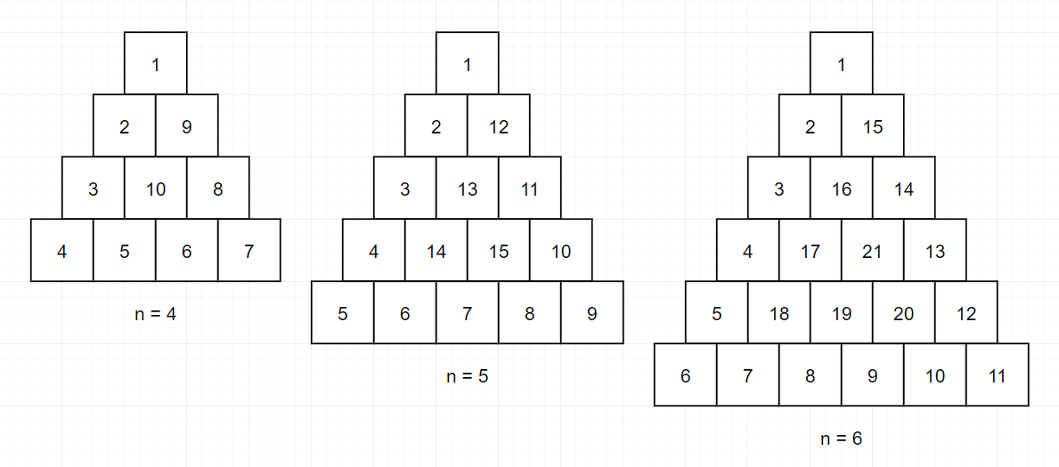 정수 n이 매개변수로 주어집니다. 다음 그림과 같이 밑변의 길이와 높이가 n인 삼각형에서 맨 위 꼭짓점부터 반시계 방향으로 달팽이 채우기를 진행한 후, 첫 행부터 마지막 행까지 모두 순서대로 합친 새로운 배열을 return 하도록 solution 함수를 완성해주세요.