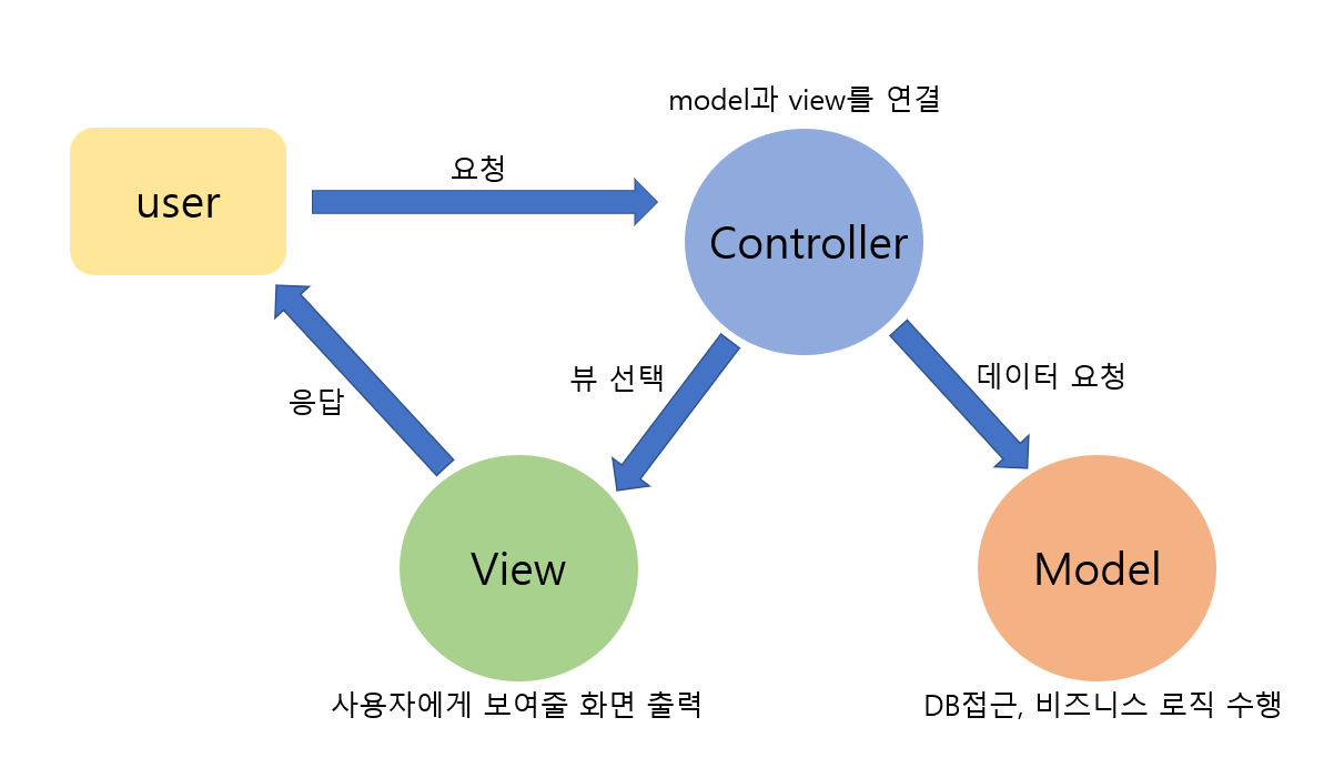 뷰에서 사용자의 데이터 선택이나 입력, 수정 등의 이벤트가 발생하면, 컨트롤러가 해당 이벤트를 처리하게 된다.