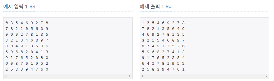 스도쿠 판을 채우는 방법이 여럿인 경우는 그 중 하나만을 출력한다.