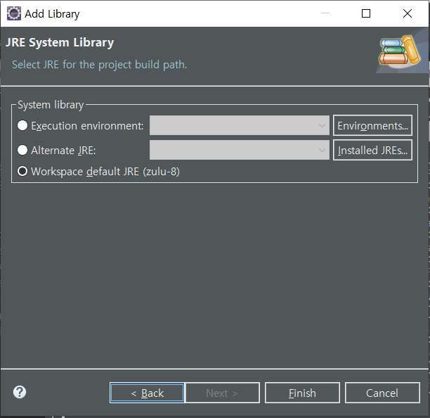 4. Workspace default JRE 선택 후 Finish