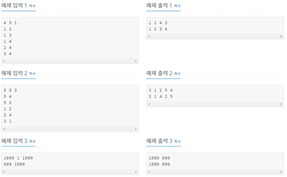 첫째 줄에 정점의 개수 N(1 ≤ N ≤ 1,000), 간선의 개수 M(1 ≤ M ≤ 10,000), 탐색을 시작할 정점의 번호 V가 주어진다. 다음 M개의 줄에는 간선이 연결하는 두 정점의 번호가 주어진다. 어떤 두 정점 사