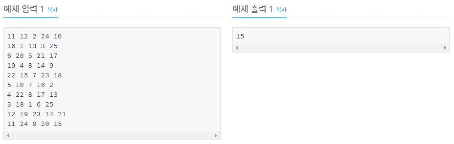 첫째 줄부터 다섯째 줄까지 빙고판에 쓰여진 수가 가장 위 가로줄부터 차례대로 한 줄에 다섯 개씩 빈 칸을 사이에 두고 주어진다. 여섯째 줄부터 열째 줄까지 사회자가 부르는 수가 차례대로 한 줄에 다섯 개씩 빈 칸을 사이에 두고 주어진다. 빙고판에 쓰여진 수와 사회자가 부르는 수는 각각 1부터 25까지의 수가 한 번씩 사용된다.