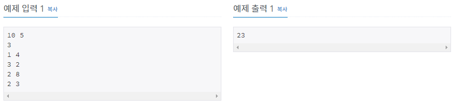 첫째 줄에 블록의 가로의 길이와 세로의 길이가 차례로 주어진다. 둘째 줄에 상점의 개수가 주어진다. 블록의 가로의 길이와 세로의 길이, 상점의 개수는 모두 100이하의 자연수이다. 이어 한 줄