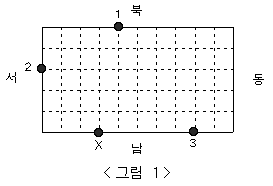 예를 들어 가로의 길이가 10, 세로의 길이가 5인 블록의 경계에 무인 경비를 의뢰한 3개의 상점이 있다고 하자. <그림 1>과 같이 이들은 1, 2, 3으로 표시되어 있고, 동근이는 X로 표시한 위치에 있다.