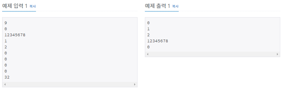 입력에서 0이 주어진 회수만큼 답을 출력한다. 만약 배열이 비어 있는 경우인데 가장 작은 값을 출력하라고 한 경우에는 0을 출력하면 된다.