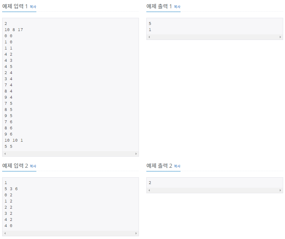 입력의 첫 줄에는 테스트 케이스의 개수 T가 주어진다. 그 다음 줄부터 각각의 테스트 케이스에 대해 첫째 줄에는 배추를 심은 배추밭의 가로길이 M(1 ≤ M ≤ 50)과 세로길이 N(1 ≤ N ≤ 50), 그리고 배추가 심어져 있는 위치의 개수 K(1 ≤ K ≤ 2500)이 주어진다. 그 다음 K줄에는 배추의 위치 X(0 ≤ X ≤ M-1), Y(0 ≤ Y ≤ N-1)가 주어진다.