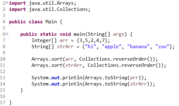 아래는 기본타입이 아닌 Integer와 String 타입의 배열을 내림차순 정렬한 코드