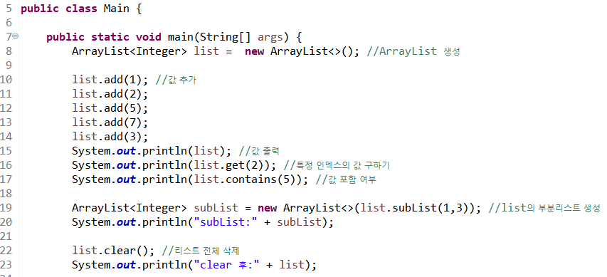 - subList(start, end) : 리스트의 start 인덱스부터 end 인덱스의 바로 앞까지 자른 새로운 리스트 생성 시 사용