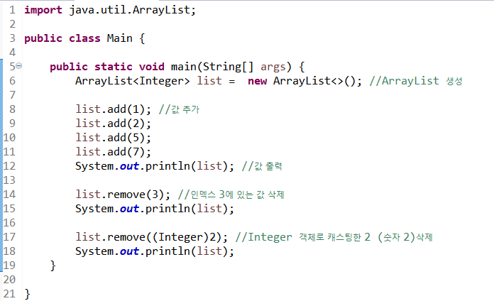 * remove를 할 때 ArrayList가 Integer를 저장하는 리스트면, remove(3)을 하면 인덱스 3이 지워진다.