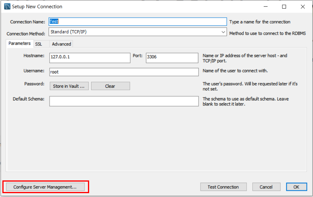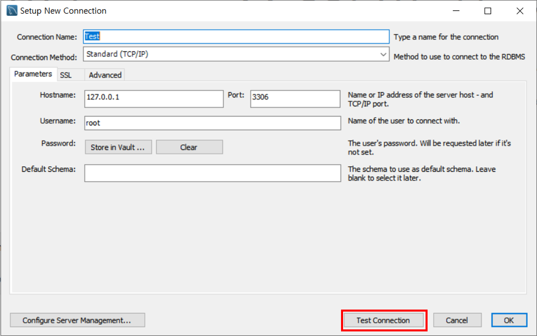 이렇게 셋팅을 해놓고 아래 Test Connection 버튼을 누르면 mysql 서버와 성공적으로 연결이 되었다고 떠야 하는데