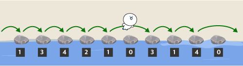 - 디딤돌의 숫자가 0이 되면 더 이상 밟을 수 없으며 이때는 그 다음 디딤돌로 한번에 여러 칸을 건너 뛸 수 있습니다.