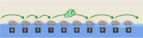 - 징검다리는 일렬로 놓여 있고 각 징검다리의 디딤돌에는 모두 숫자가 적혀 있으며 디딤돌의 숫자는 한 번 밟을 때마다 1씩 줄어듭니다.